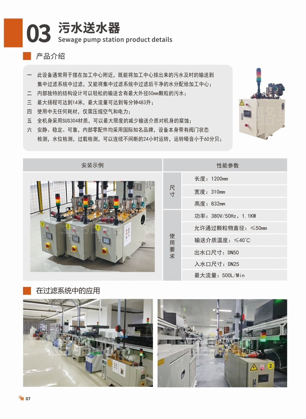 此設備通常用于加工中心附近,既能將加工中心排出來(lái)的污水及時(shí)的輸送到集中過(guò)濾系統中進(jìn)行過(guò)濾,又能將集中過(guò)濾系統中過(guò)濾后的干凈液體分配給加工中心以循環(huán)利用;